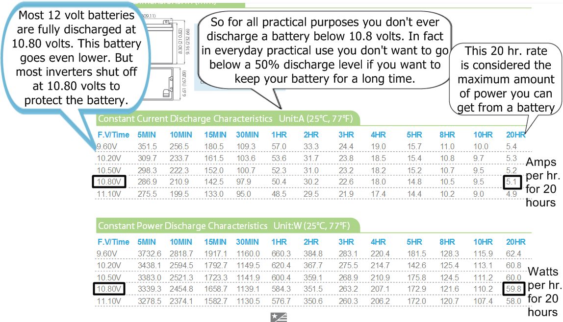 formula for that is P-out /.9 = P-in or Now we know we need 114.4 watts off our battery/s continuously to keep our fridge and laptop going. Now our inverter will keep drawing about 114 watts from the battery until the battery/s reache 10.8 volts. This is the voltage level most inverters are set to shut off at to keep from damaging the battery. It is also the most commonly used figure to indicate 100% discharge on a 12 volt battery system. In other words, when a lead acid battery, of any type reaches 10.8 volts, it is considered fully discharged. So inverter makers shut off their inverters at that level too. There are two ways we can now calculate how long our system will run with this load. Again our example is our 800 watt system being used for these calculations. Below is a chart of the battery we use in the 800 watt system. It has a 20 hr. rate of 5 amps. That means this battery can give you 5 amps for 20 full hours before 100 percent discharge. So we need to see what the amperage is for our power need of 114.4 watts from above calculations. Since a battery voltage changes as it discharges, I will use the "average" voltage of 12 volts for our battery. (12 volts is actually about 35% discharge level) Again the formula we need is I = P/E 114.4 / 12 = 9.53 amps as our current draw on a continuous basis. Now lets look at our battery chart and see how long it can supply that kind of current or amps.